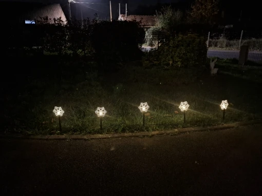5-teiliges Set solarbetriebener Schneeflocken-Sternen-Wegeleuchten mit warmem LED-Licht und IP65-Wasserschutz. Einfache Erdspießmontage für Gärten, Höfe und Weihnachtswege.