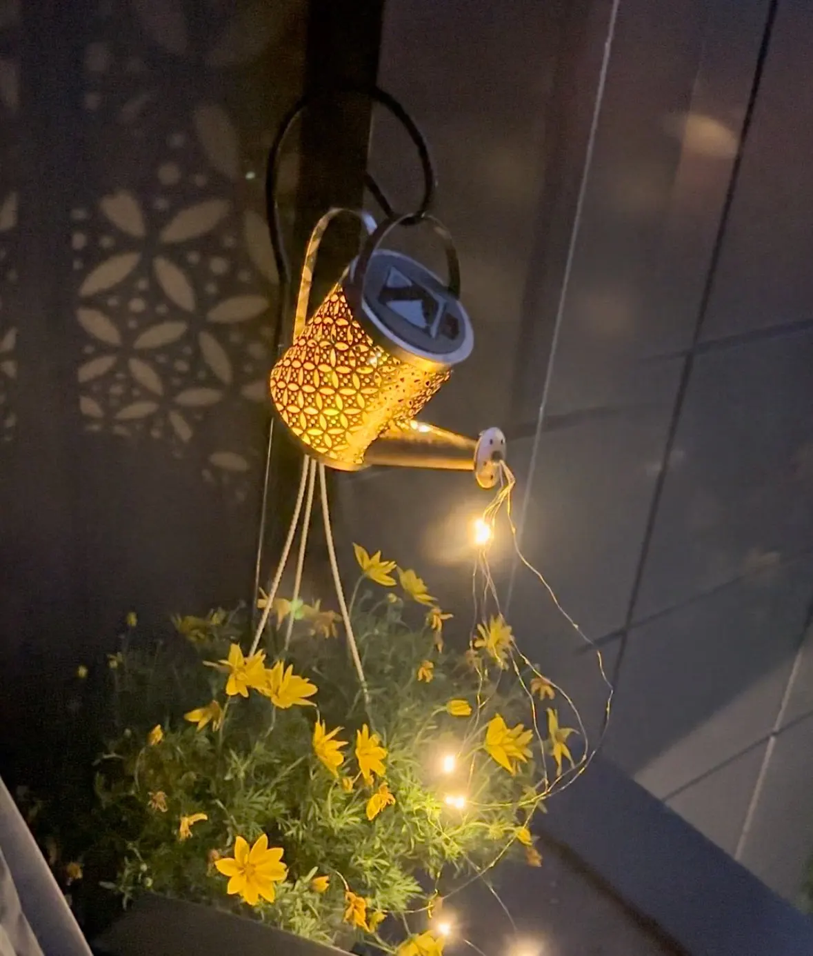 Solarbetriebene Gießkannen-Gartenleuchte mit Wasserfall-Effekt dank flexibler LEDs aus Kupferdraht. Wasserdichtes Metallgehäuse (IP65) mit automatischem Ein-/Ausschalter. Ideal für Garten, Hof, Veranda und Landschaftsgestaltung.