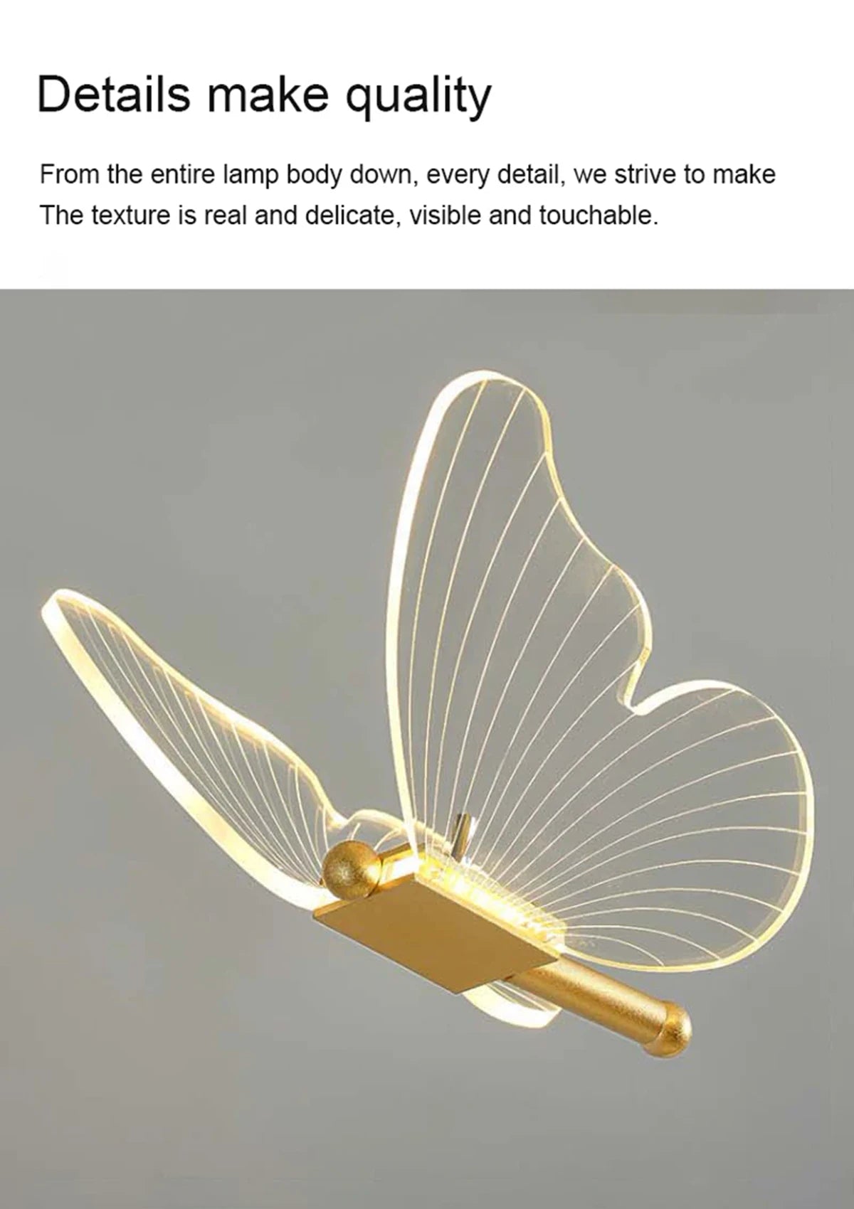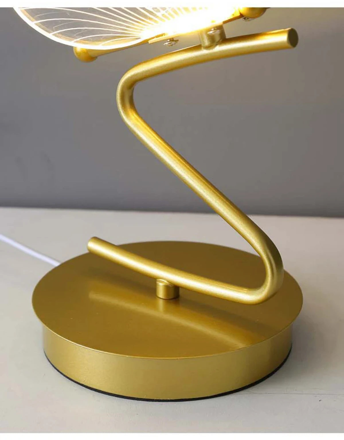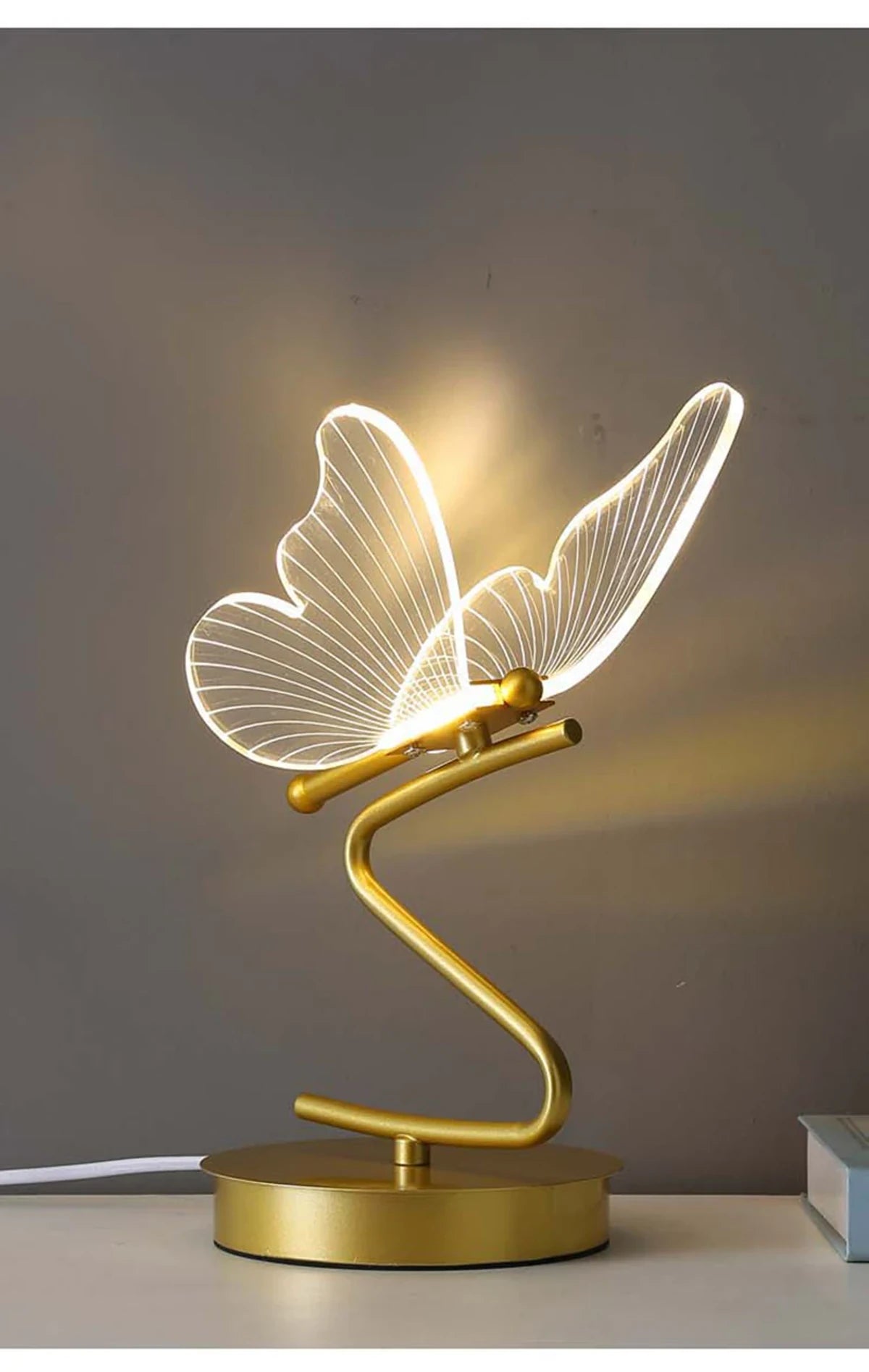 - Einzigartiges Schmetterlingsdesign: Diese Lampe besticht durch ihr atemberaubendes Schmetterlingsdesign mit einem transparenten Korpus, der im eingeschalteten Zustand leuchtet und so einen faszinierenden Effekt erzeugt. Der goldene Sockel und Stiel erinnern an einen Ast und erwecken den Eindruck eines darauf sitzenden Schmetterlings – eine verspielte und elegante Note für jeden Raum.
