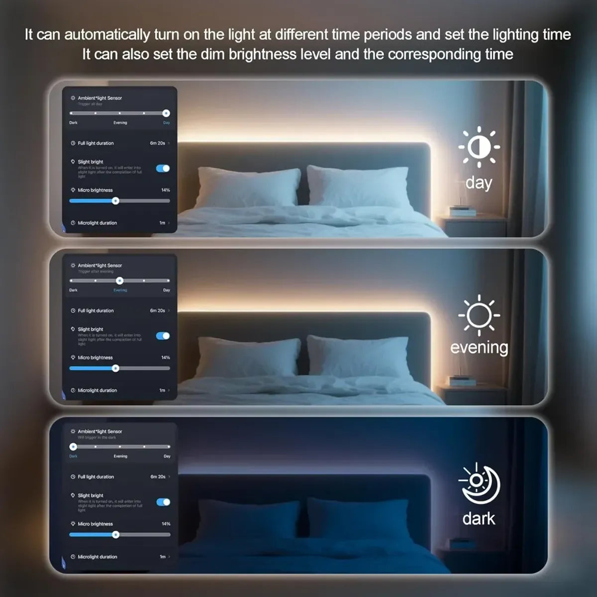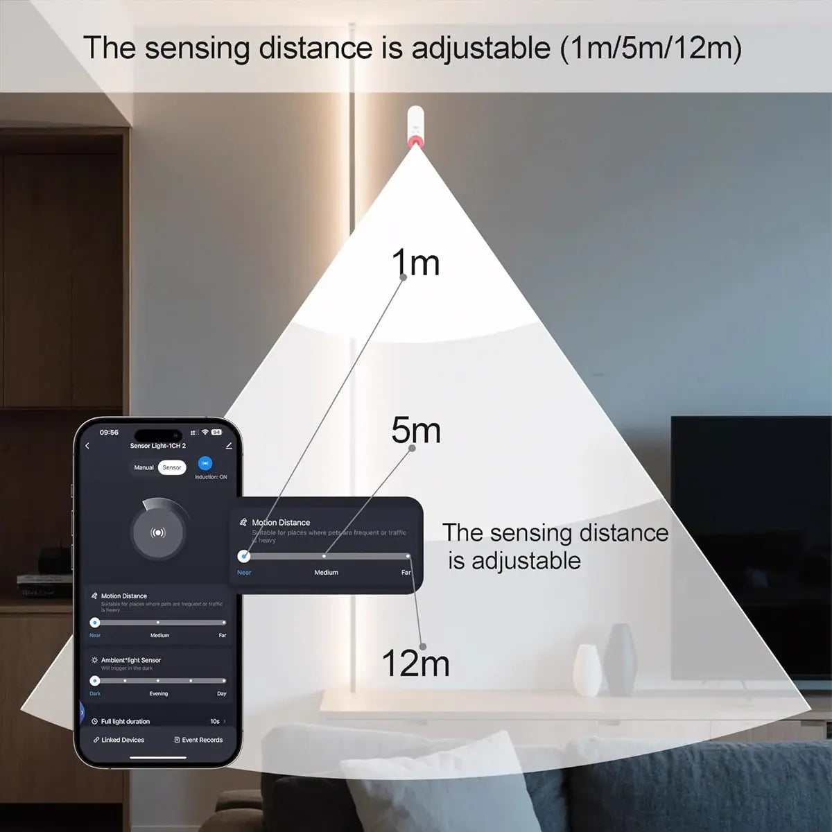• Der Erfassungsabstand, die Verzögerungszeit und der Lichtschwellenwert können über die App eingestellt werden.