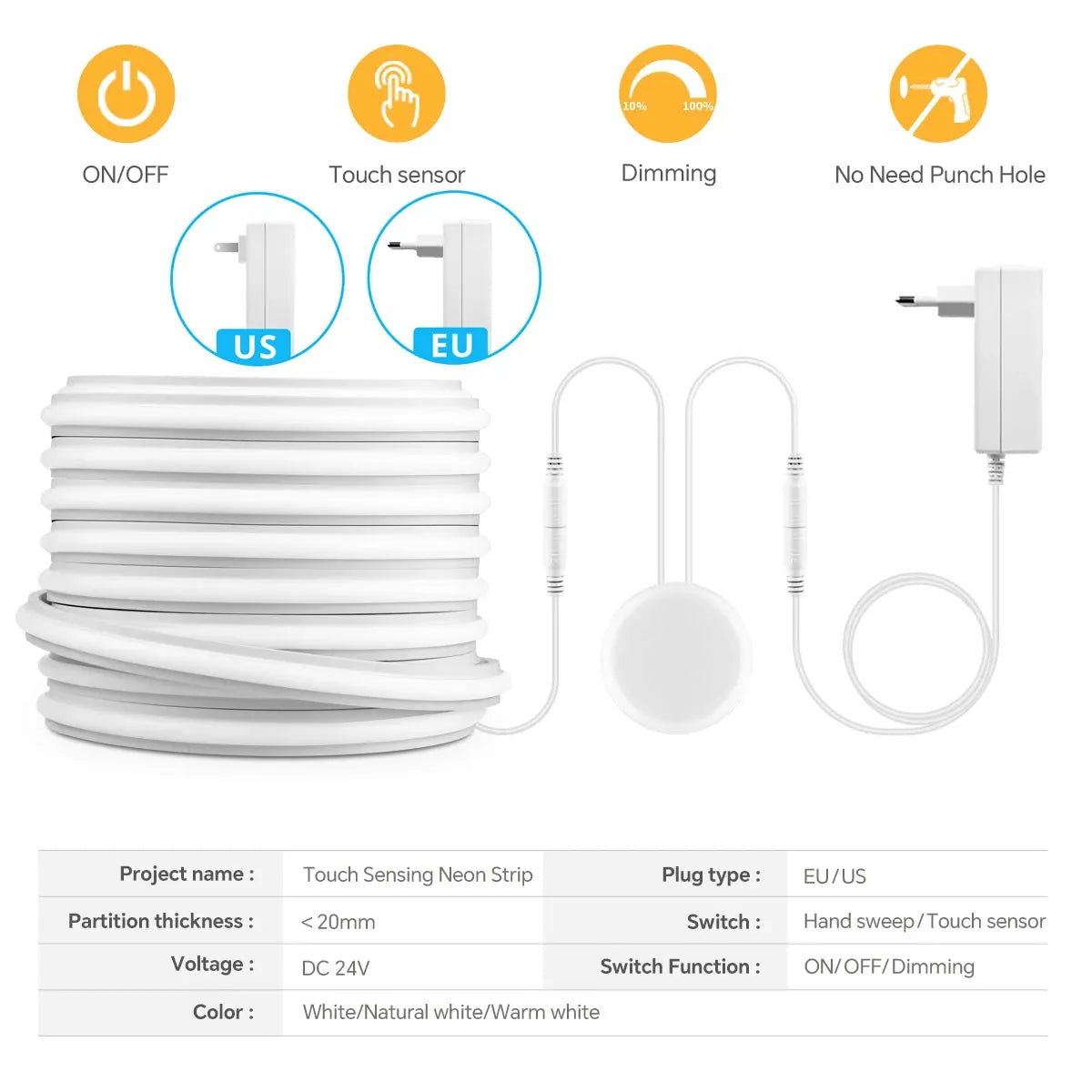 Self-adhesive COB LED under cabinet light strip with touch dimming and hand-sweep control. Flexible silica gel neon tape, 24V DC, ideal for kitchen, closet, and shelf accent lighting.