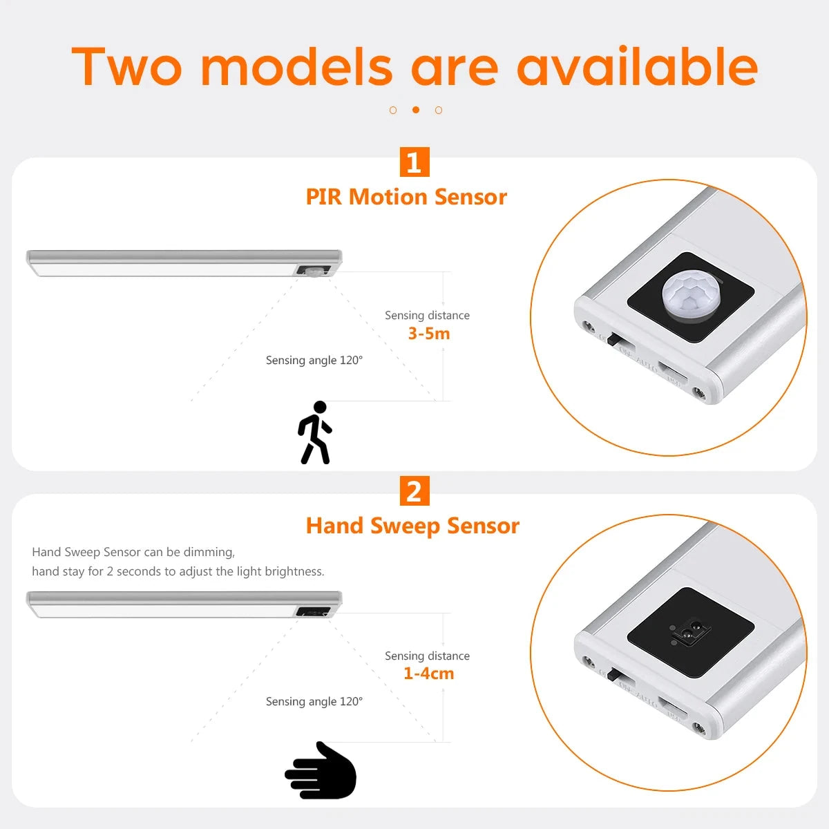 Ultra-slim 20cm/40cm LED cabinet light with white, warm, and natural tones. USB rechargeable, motion sensor, and magnetic mounting for easy, eco-friendly under-cabinet lighting.